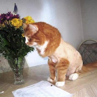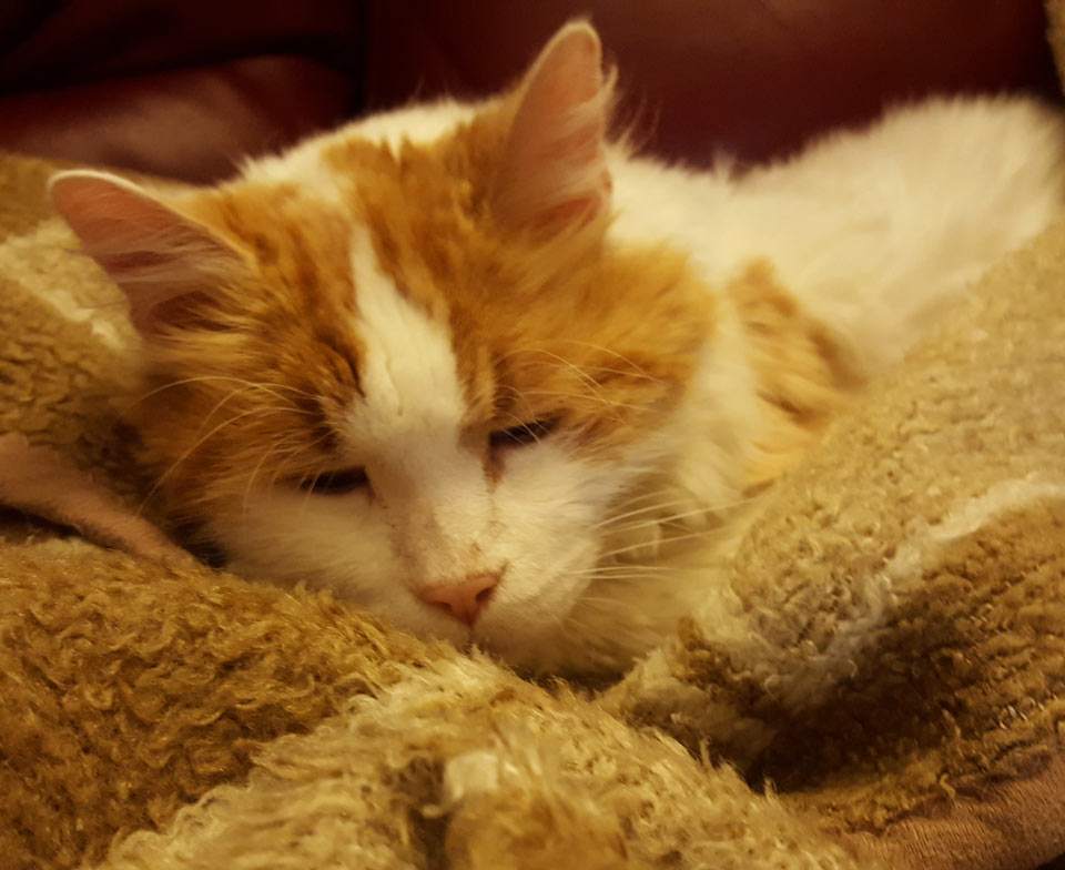 Over a long cold Winter, the old orange cat huddled under one porch after another in a neighbourhood in a Northern BC town. A known cat-rescuer was told about the old cat by several concerned people. But each time she was told where he was, he had crept away, still searching for food and warmth and help. His coat was matted right down to his skin so that it held his back legs together. He crept because stretching his skin to walk was terribly painful.
