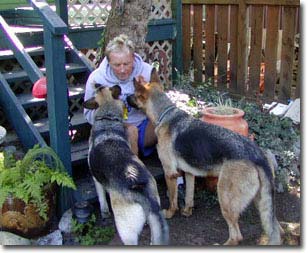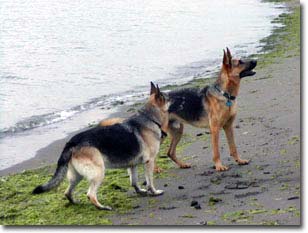 Here we are at the beach, about 1 hr after you left....we took the leash off as he was having a great time and being so obedient...the gang at the park all loved him .....Jerry loves to chase the waves, but doesn't bark at them, he also loves to fetch sticks in the water, only sticks, no interest in balls or toys....but he can't swim!!! I have never seen a dog actually SINK before!!!..Out he went after his stick, hit the drop off and sank like a stone...but up he popped (thank heavens as I was ready to go in after him!) and wasn't scared at all, couldn't keep him out of the water! He let all of our lady friends give him a quick pat, and he wasn't even too fazed by the men he met, but they all knew he was our " new dog" so nobody pushed it and all was well....he just finished polishing off 1/2 bowl of Innova crunchies. Maybe he thought they were treats!...Jerry is definitely female oriented, doesn't let me out of his sight, right now as I am at the computer he is sitting quietly beside me with his head on my knee, nosing at my hand to get me to pat him....at the beach he kept running back and forth between myself and Mark to make sure we were both there. Anyway..that's this afternoon's update.