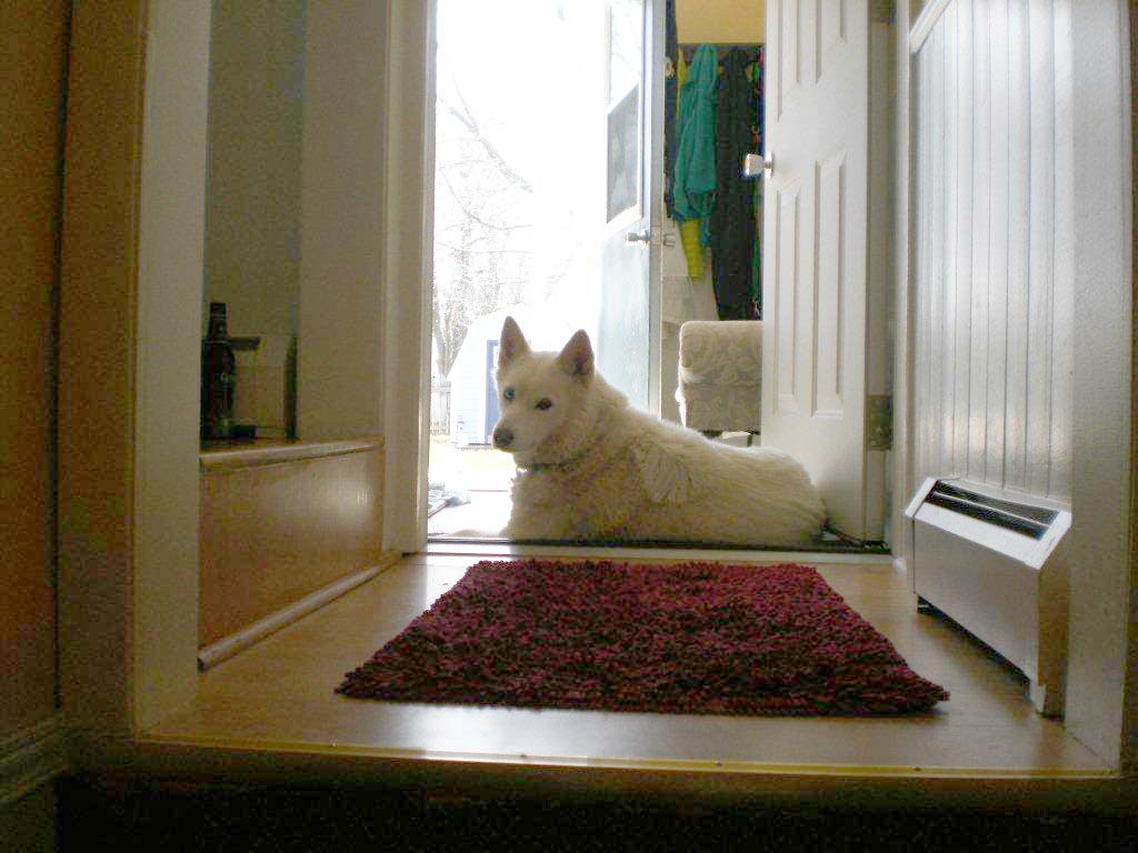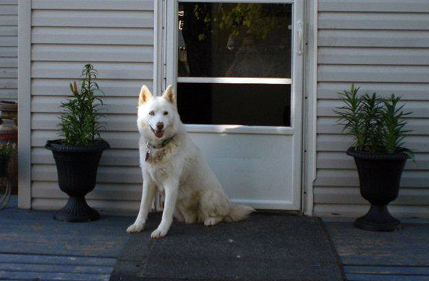 “One day, as I took my dog for a walk in a town I was visiting, I saw a white Husky in the snow, chained to a small disgusting doghouse which was surrounded by body-holes that the dog had dug.